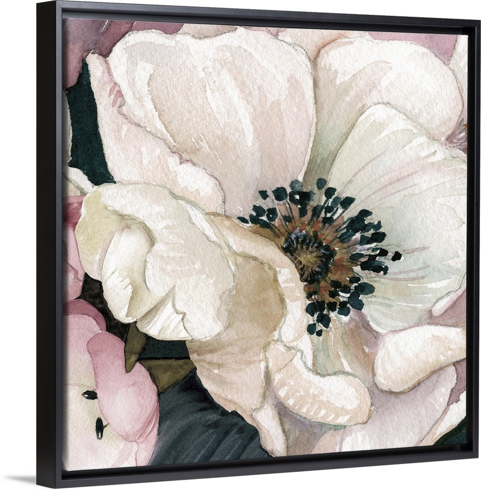 <p>Close-up painting of a white anemone with pink petals surrounding it, on a square background.</p>