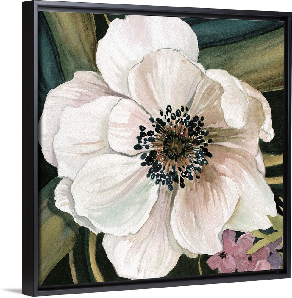 <p>Square watercolor painting of a white anemone flower with a leafy blue and green background.</p>