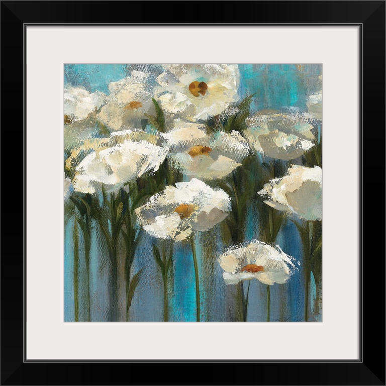<p>Contemporary floral painting of blooming white flowers and stems sticking up on a texture cool background.</p>