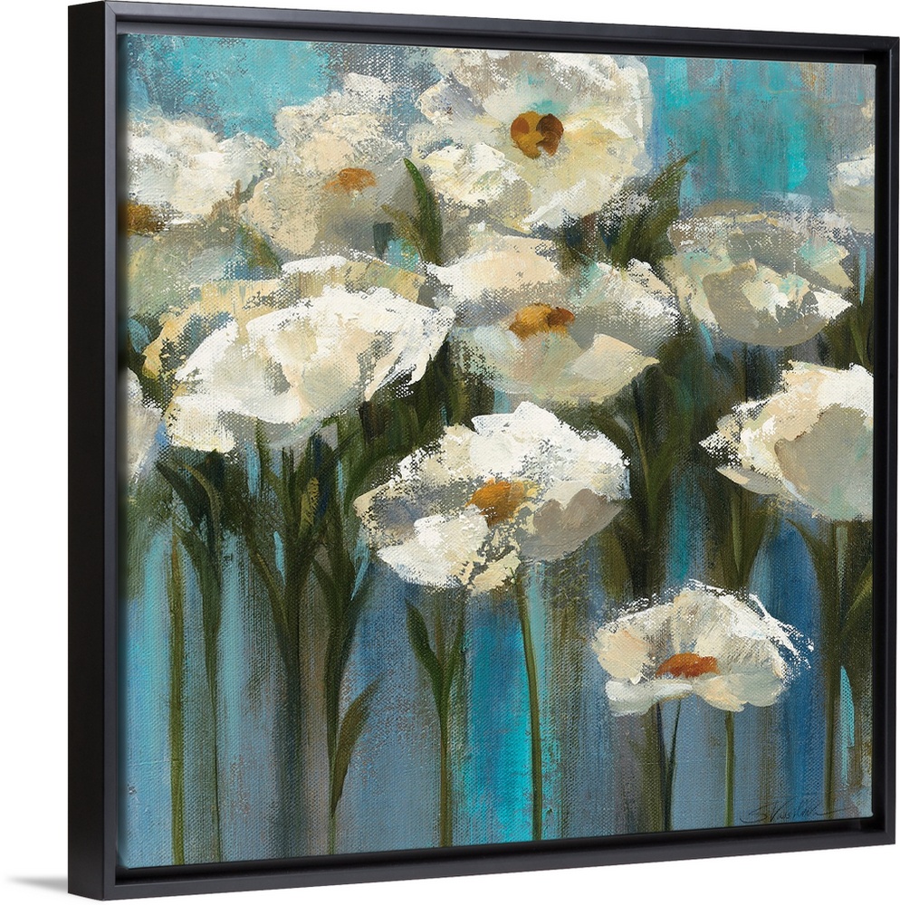 <p>Contemporary floral painting of blooming white flowers and stems sticking up on a texture cool background.</p>