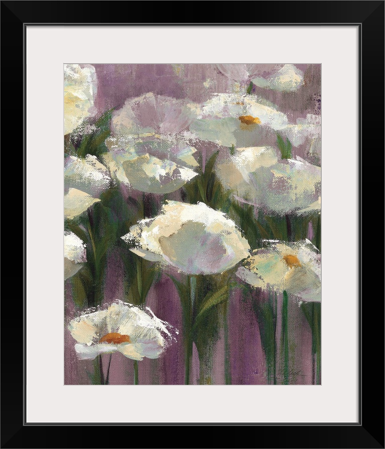 <p>Contemporary artwork of white flowers close-up in the frame of the image. Against a dark purple background.</p>