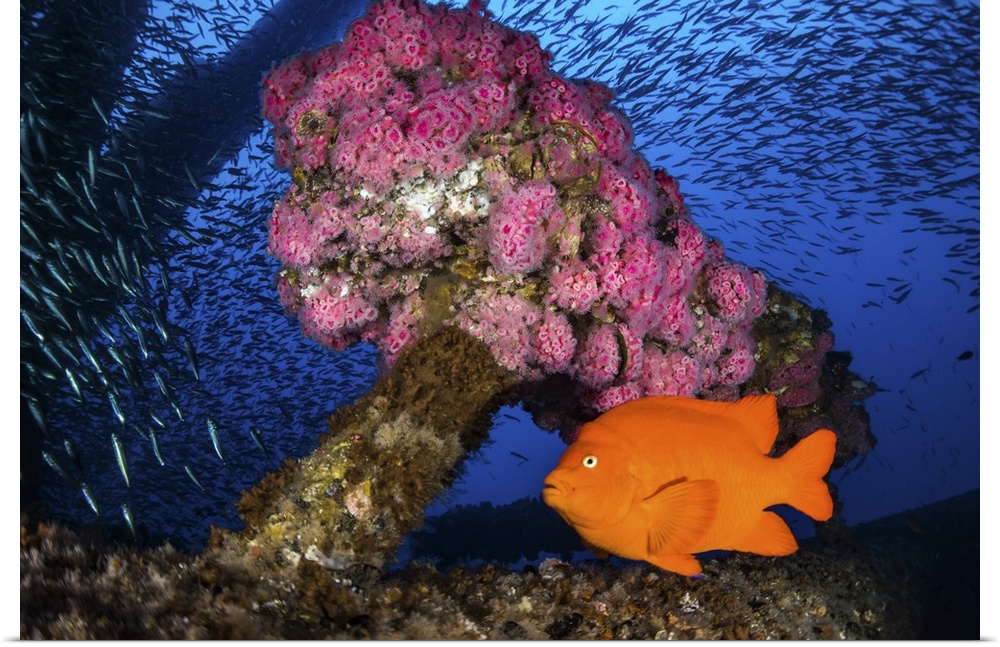 <p>Anemone's decorate the structure of the oil rig with Garibaldi and baitfish.</p>