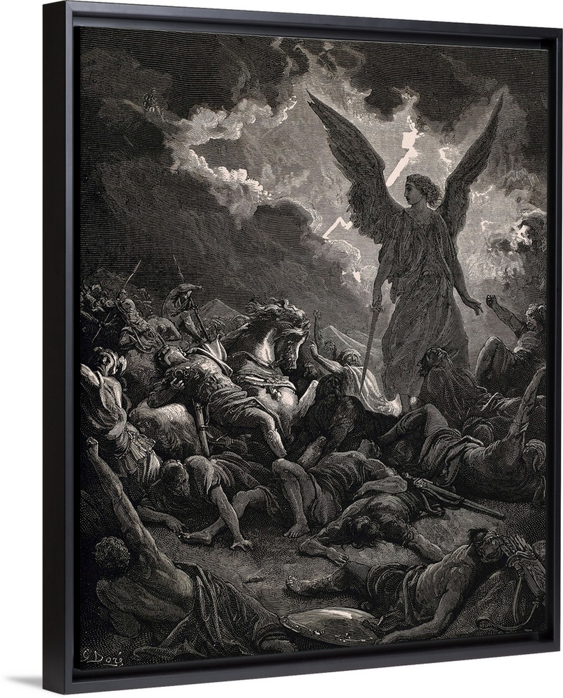 <p>Dore, Paul Gustave (1832-1883). La Sainte Bible. 1866. Angel of Yahweh of the army of Sennacherib. Engraving. -</p>