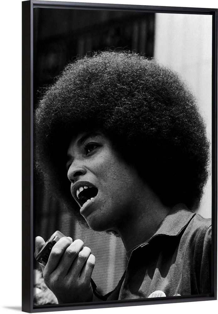 <p>ANGELA DAVIS (1944- ). American political activist. Speaking to the press at the University of California at Los Angeles, after teaching her first class there as a professor of philosophy, 6 October 1969.</p>