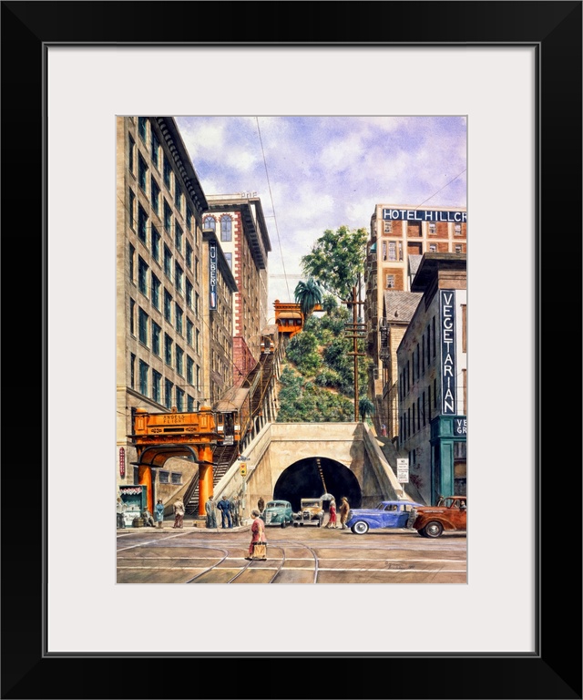<p>Contemporary painting of a tunnel between tall building in a city.</p>
