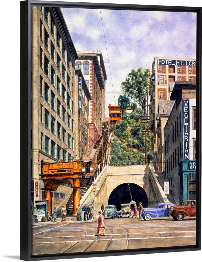 <p>Contemporary painting of a tunnel between tall building in a city.</p>