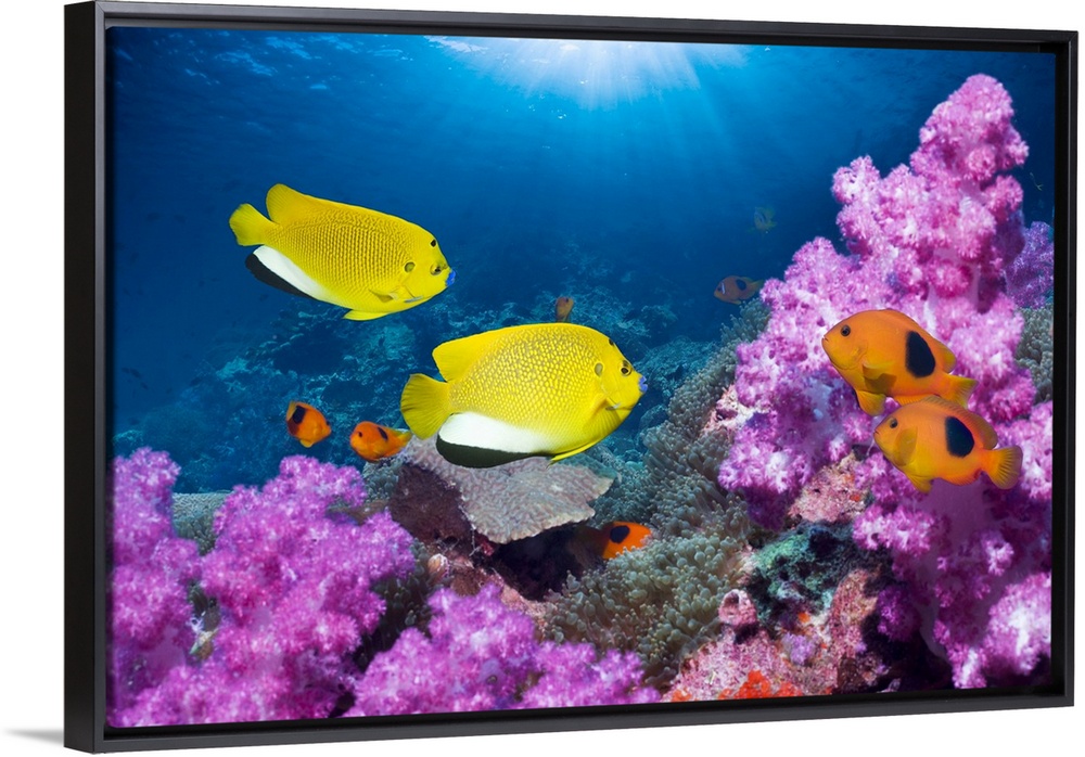 <p>Angelfish and anemonefish on a reef. Threespot angelfish (Apolemichthys trimaculatus, left) and red saddleback anemonefish (Amphiprion ephippium, right) swimming over pink carnation (Dendronephthya sp.) soft corals on a reef. Photographed in the Andaman Sea, Thailand.</p>