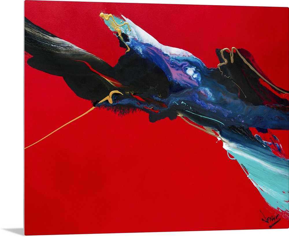 <p>Contemporary abstract painting using wild and vivid colors against a red background.</p>
