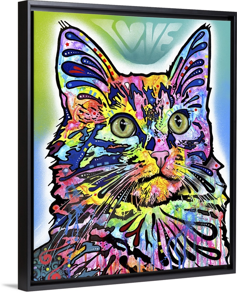 <p>Vibrant illustration of a colorful cat with graffiti-like designs all over and "Love" spray painted at the top.</p>