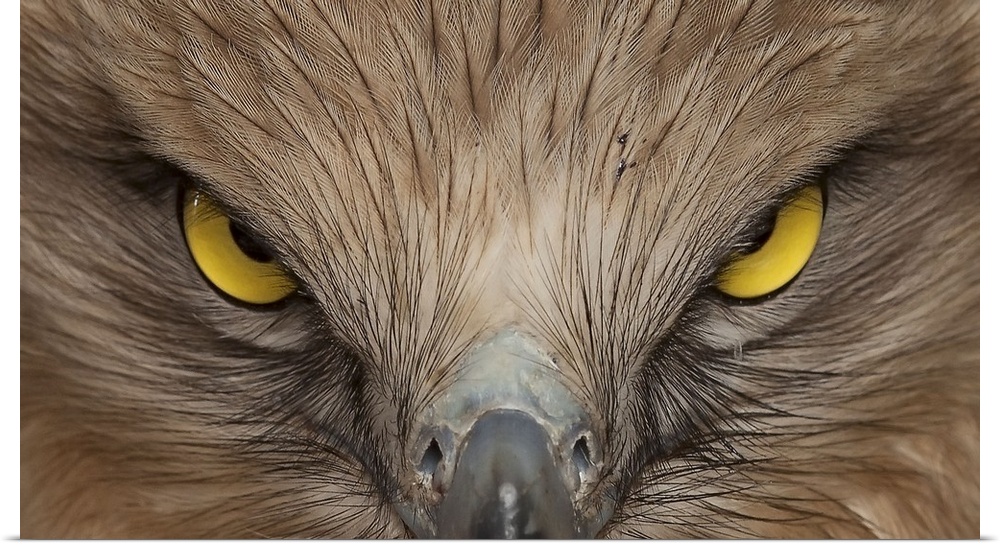 <p>Extreme close-up photograph of a hawk face straight on.</p>