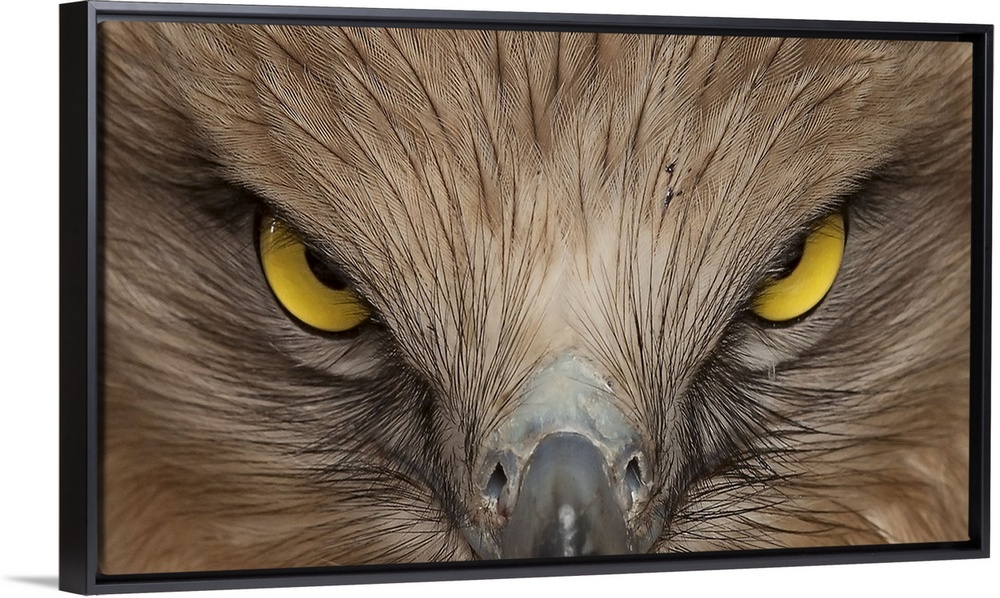 <p>Extreme close-up photograph of a hawk face straight on.</p>