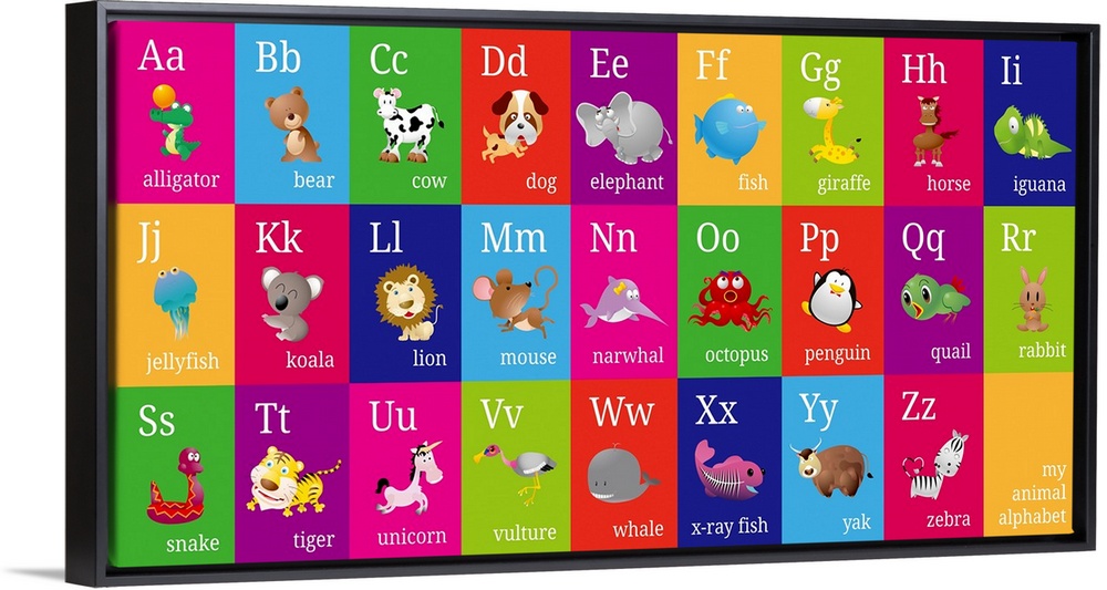 <p>Bright and colorful contemporary animal alphabet, with upper and lowercase alphabet letters, and animal names and pictures.</p>