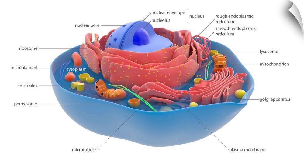 <p>Animal cell components and organelles, illustration. The cell is enclosed in a plasma membrane (blue). The central nucleus (blue) includes the nucleolus (dark blue), the nuclear envelope and nuclear pores (holes). The rough endoplasmic reticulum (pink) has ribosomes (yellow dots). Smooth endoplasmic reticulum (pink filaments) is at upper right. The Golgi apparatus (pink, folded) is at lower right. Also shown are mitochondria (orange, elongated), microtubules (green strands), microfilaments (purple strands), centrioles (yellow cylinders), lysosomes (yellow globules) and peroxisomes (orange, spherical). For this artwork without labels, see image C023/8728.</p>