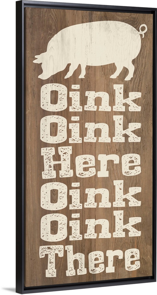 <p>"Oink Oink Here Oink Oink There" written on a wooden background with a pig silhouette at the top.</p>