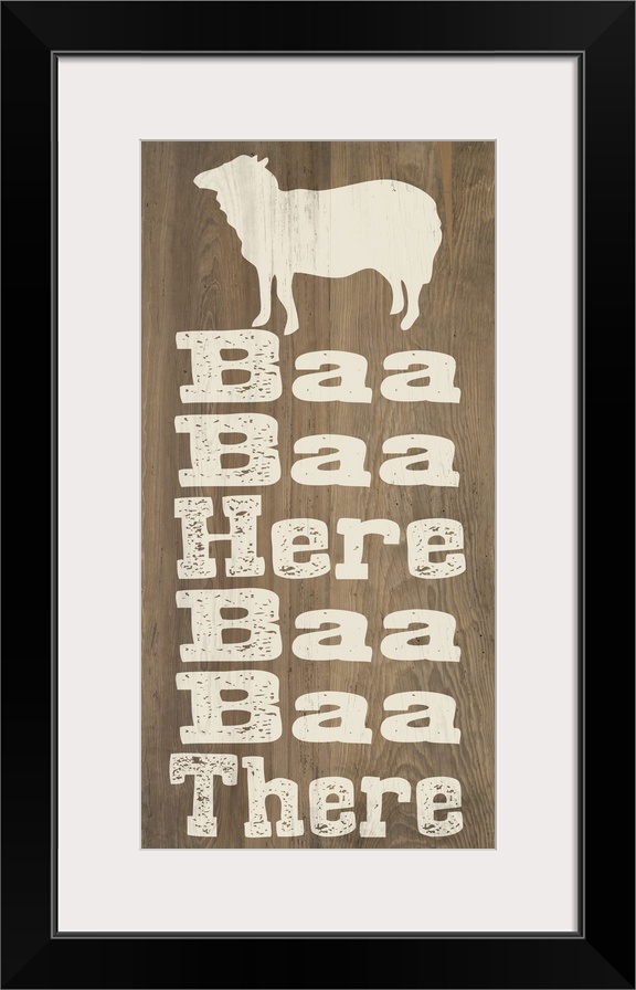 <p>"Baa Baa Here Baa Baa There" written on a wooden background with a sheep silhouette at the top.</p>