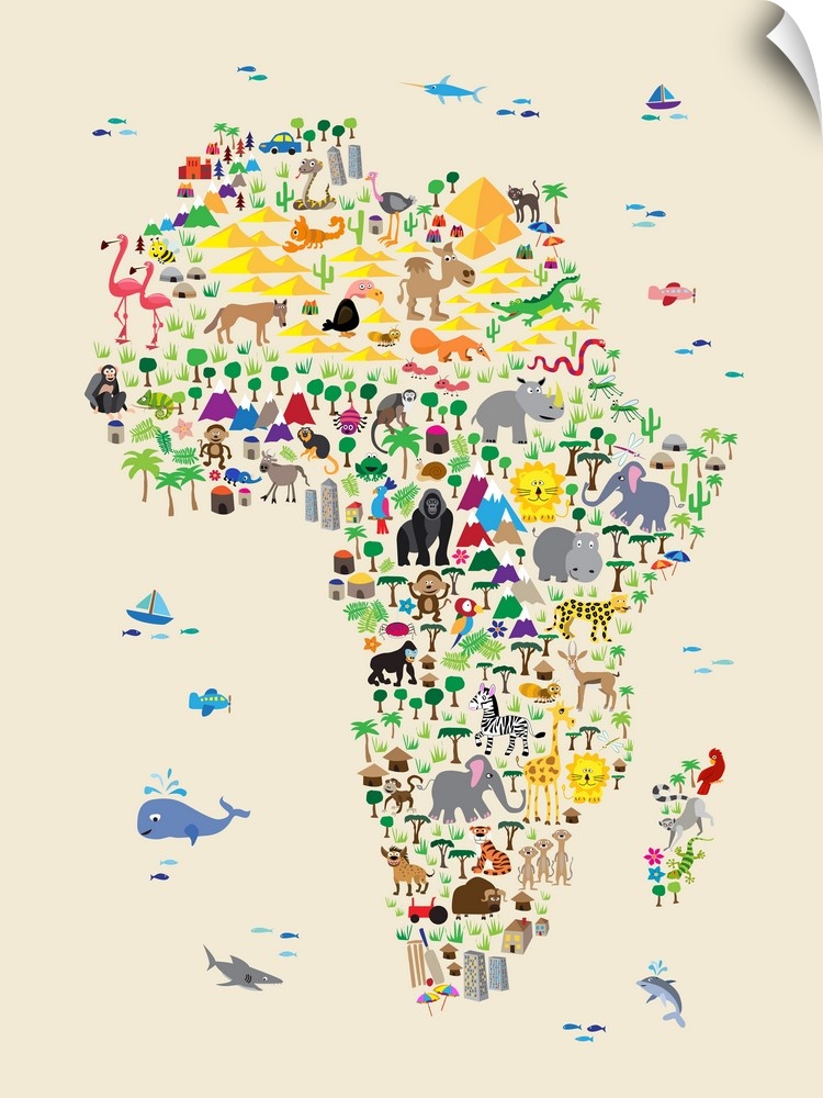 <p>A map of the Africa featuring cartoon animals. A colorful, fun and exciting map for any young child to engage their imaginations. Beige Background.</p>