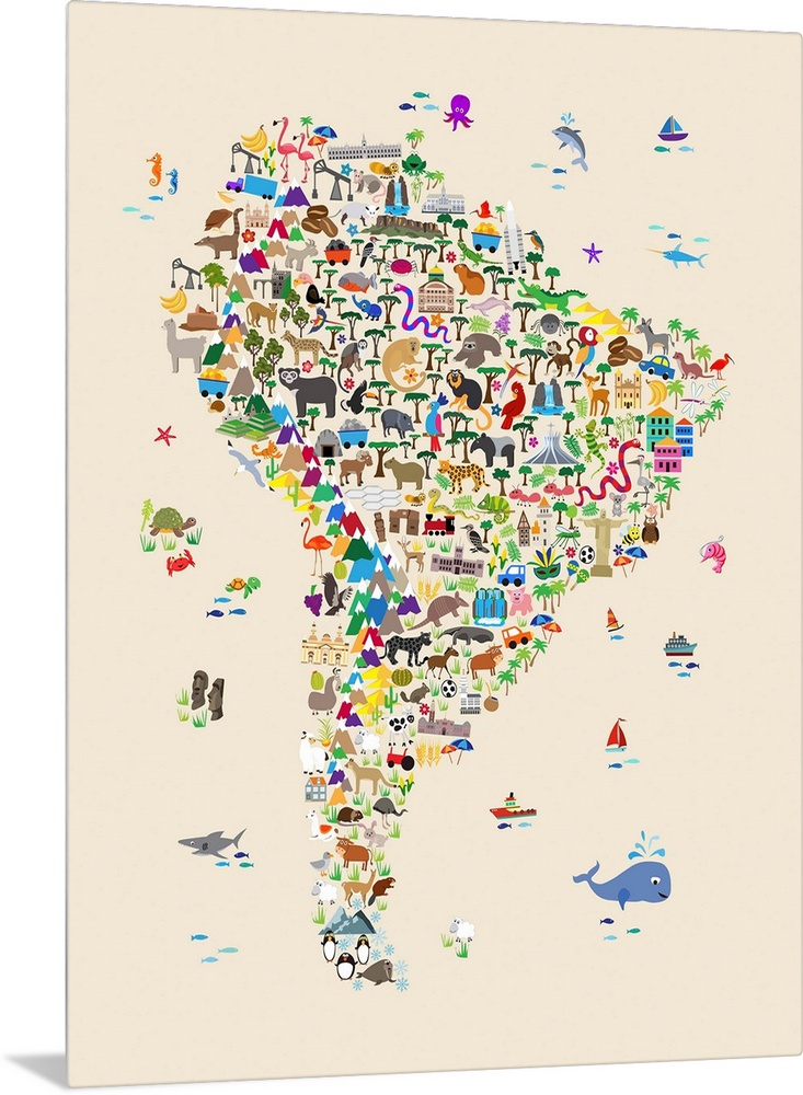 <p>A map of South America featuring cartoon animals, famous landmarks, and buildings. A colorful, fun and exciting map for any young child to engage their imaginations. Beige Background.</p>