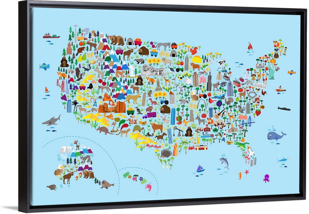 <p>A map of the United States featuring cartoon animals, famous landmarks, and buildings. A colorful, fun and exciting map for any young child to engage their imaginations. White Background.</p>