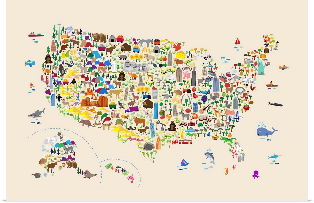 <p>A map of the United States featuring cartoon animals, famous landmarks, and buildings. A colorful, fun and exciting map for any young child to engage their imaginations. White Background.</p>