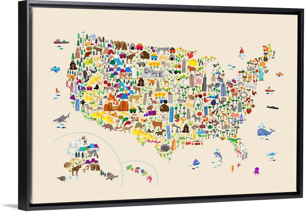 <p>A map of the United States featuring cartoon animals, famous landmarks, and buildings. A colorful, fun and exciting map for any young child to engage their imaginations. White Background.</p>