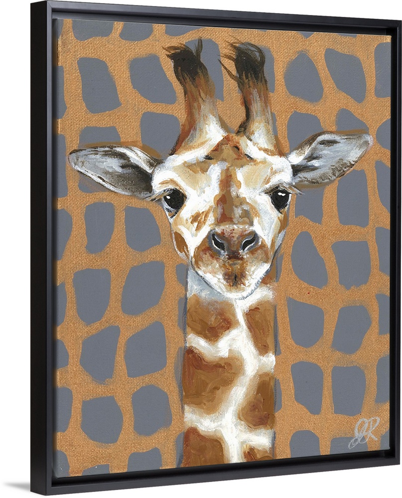 <p>A delightful portrait of a giraffe with a gray and metallic gold giraffe patterned background.</p>