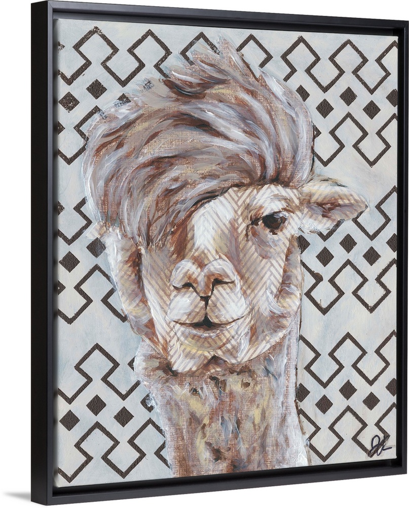 <p>An engaging portrait of a llama with light gray lines on it's face and a gray and metallic gold patterned background.</p>