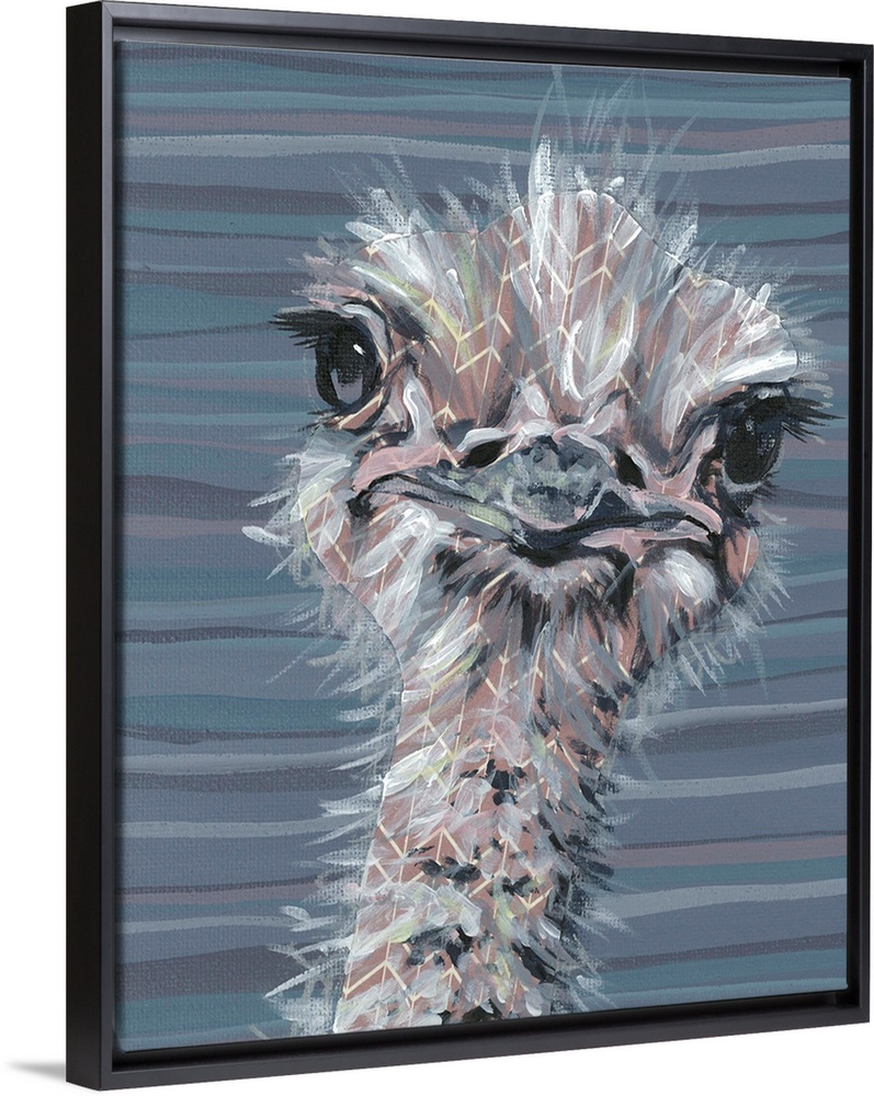 <p>A engaging portrait of an ostrich with a grey, pink and blue striped background.</p>