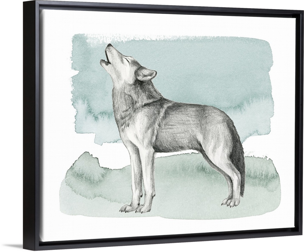 <p>Graphite sketch of a howling wolf on a blue, green, and white watercolor background.</p>