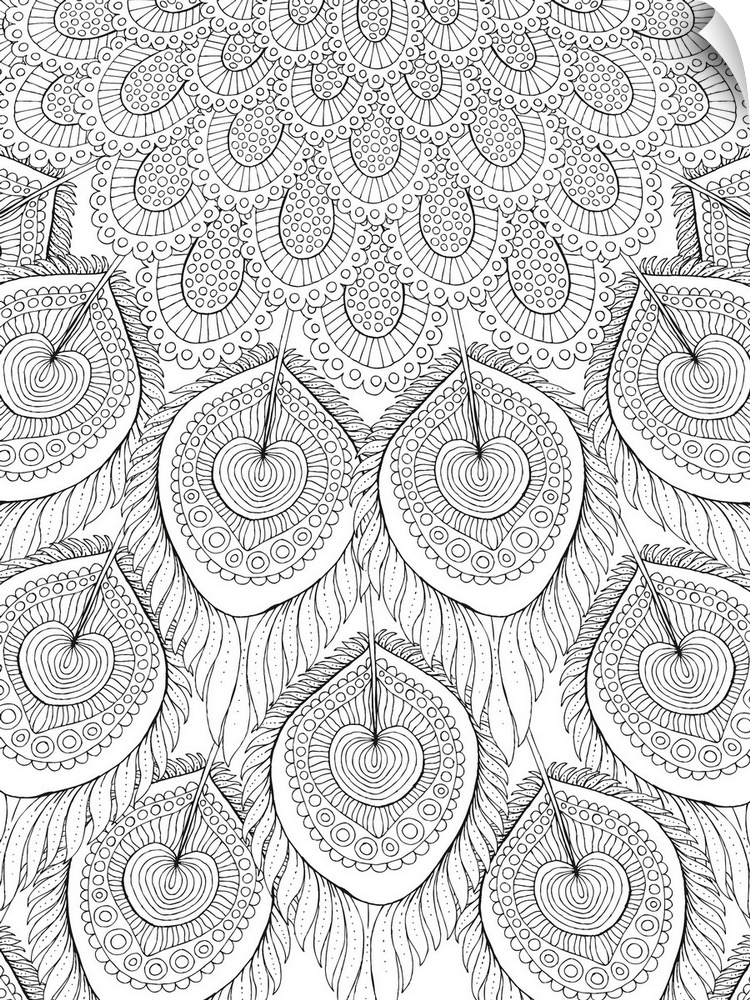 <p>Black and white line art of intricately designed peacock feathers.</p>