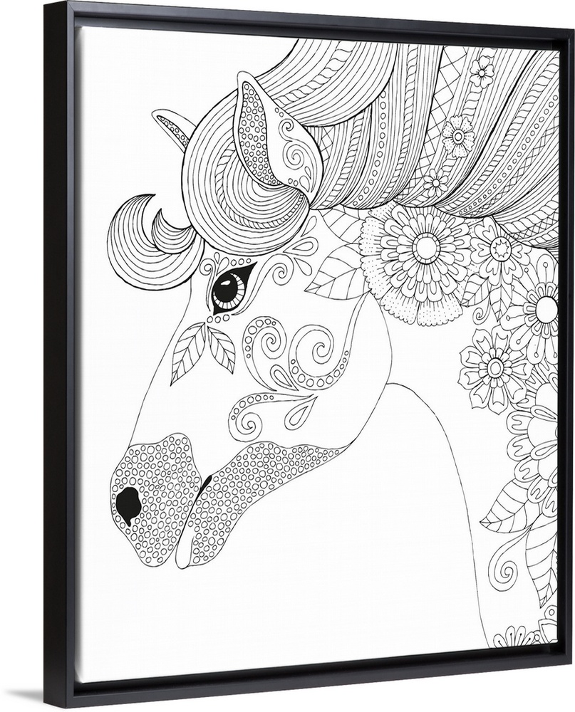 <p>Black and white line art of a uniquely designed unicorn with floral print.</p>