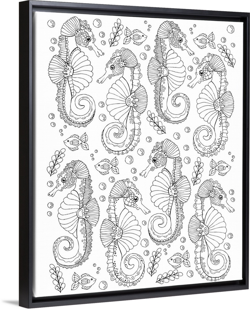<p>Black and white line art with a pattern of seahorses, bubbles, fish, and algae.</p>