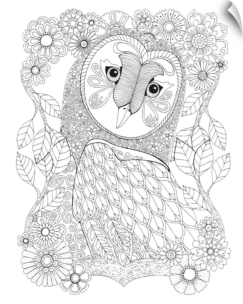 <p>Black and white line art of an intricately designed owl surrounded by flowers and leaves.</p>