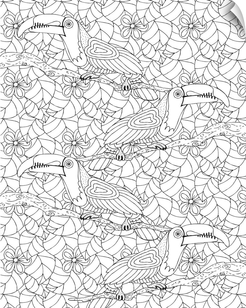<p>Black and white line art with a busy pattern of toucans on branches with tropical flowers and leaves.</p>