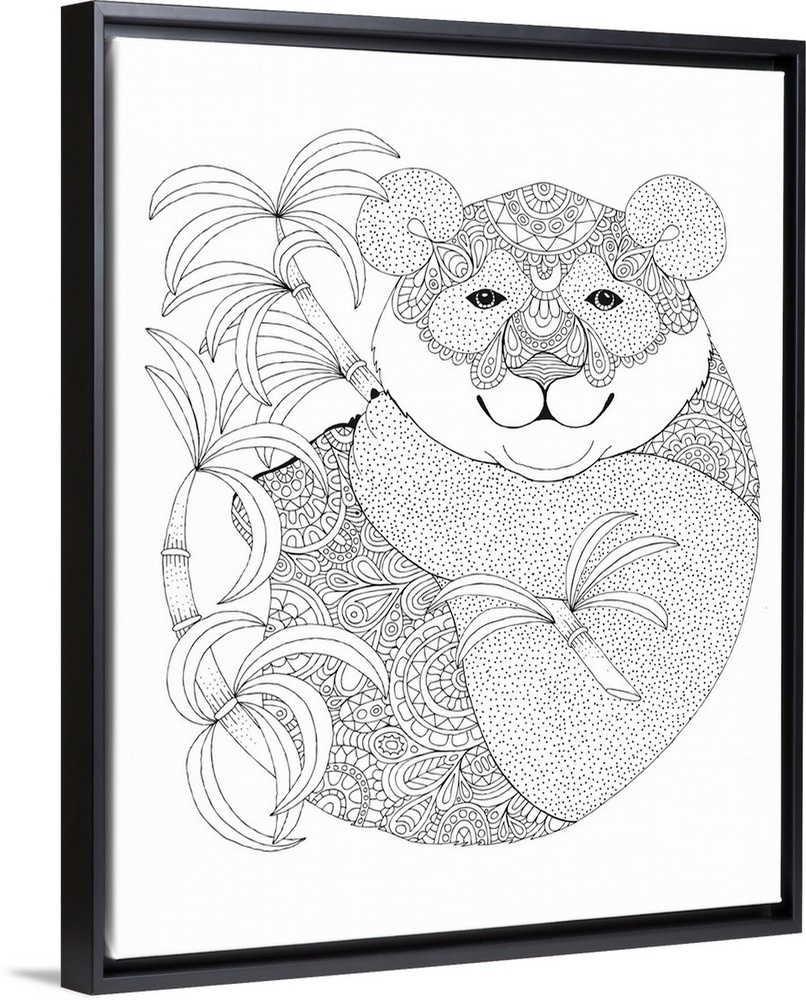 <p>Black and white line art of a uniquely designed koala bear with bamboo.</p>