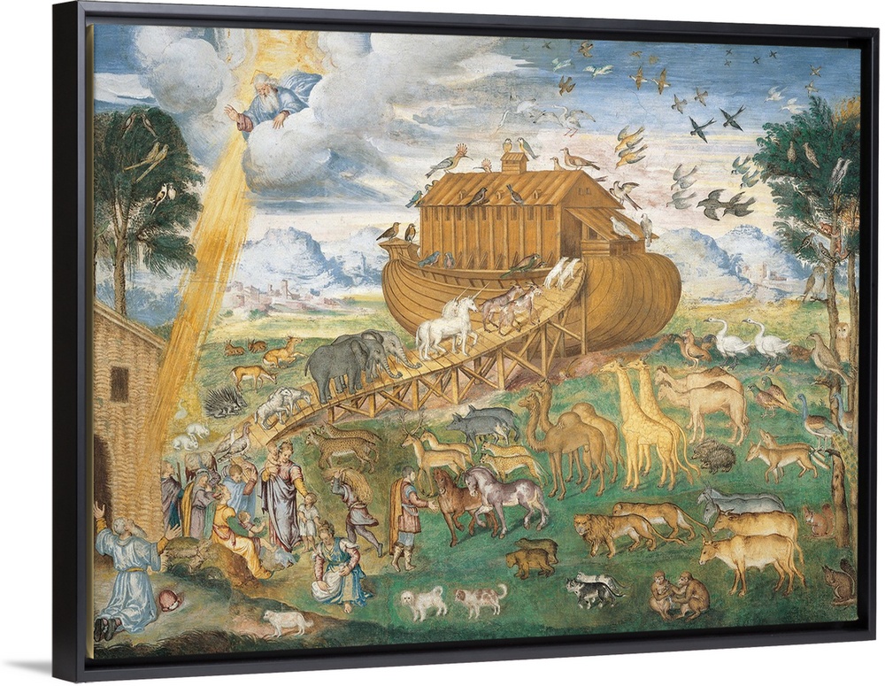 <p>The Animals Enter Noahs Ark, by Aurelio Luini, 1555 about, 16th Century, fresco, - Italy, Lombardy, Milan, San Maurizio al Monastero Maggiore Church, Arca di No Chapel. All. Ark ship Noah God the Father clouds light couples animals birds gangway gangplank</p>
