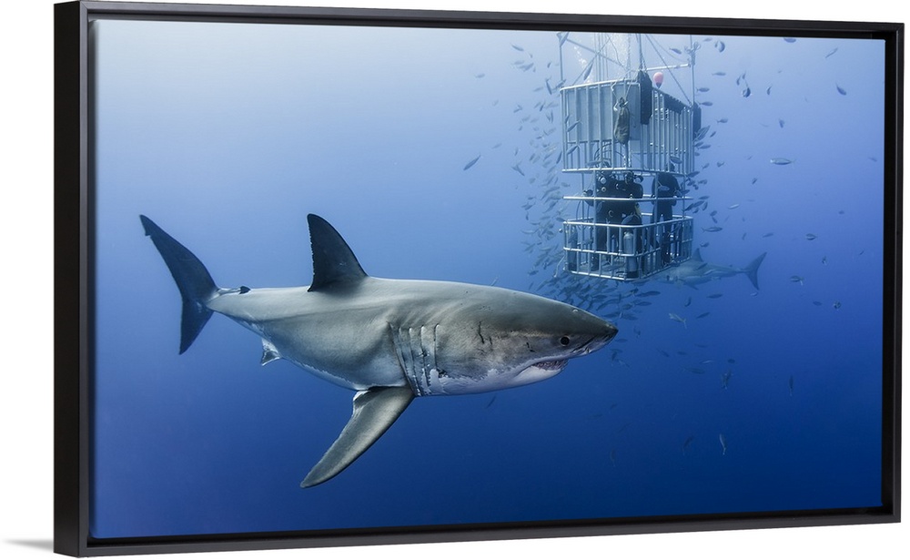 <p>A Great White Shark circling scuba divers in a metal cage.</p>