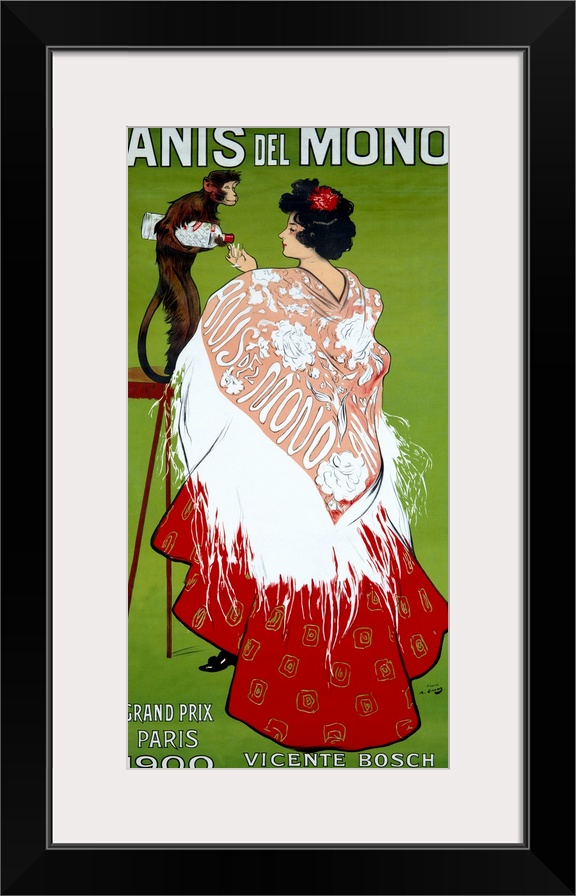<p>Vintage advertisement for alcohol featuring a small monkey pouring a bottle of anise liquor into a shot glass held by a woman with a decorative shawl.</p>