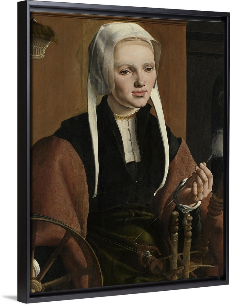 <p>Anne Codde, wife of Pieter Gerritsz Bicker, by Maarten van Heemskerck, 1529, Dutch painting, oil on panel. Seated at a spinning wheel, which was a symbol of the virtuous woman. The little basket on the wall is probably holding the balls of yarn already sp</p>