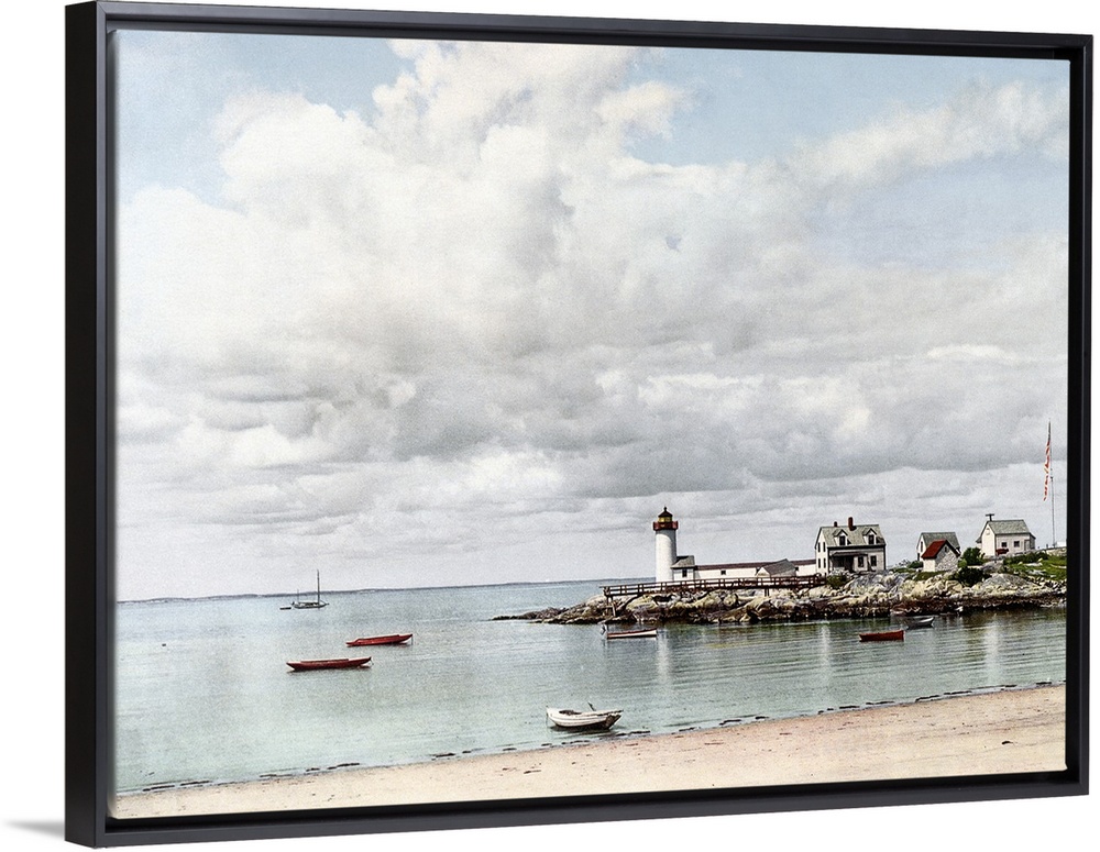 <p>This large piece shows boats with no one in them sitting in the water. A lighthouse stands at the edge of land that protrudes out into the water.</p>