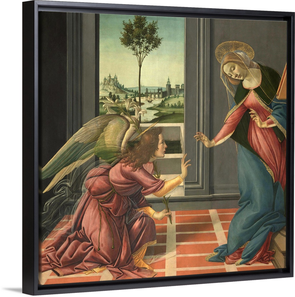 <p>The Annunciation, by Sandro Filipepi Known as Botticelli, 1489 - 1490, 15th Century, panel, cm 150 x 156 - Italy, Tuscany, Florence, Uffizi Gallery. Total Annunciation without frame Virgin Annunciated Angel Annunciating Archangel Gabriel interior prie die</p>