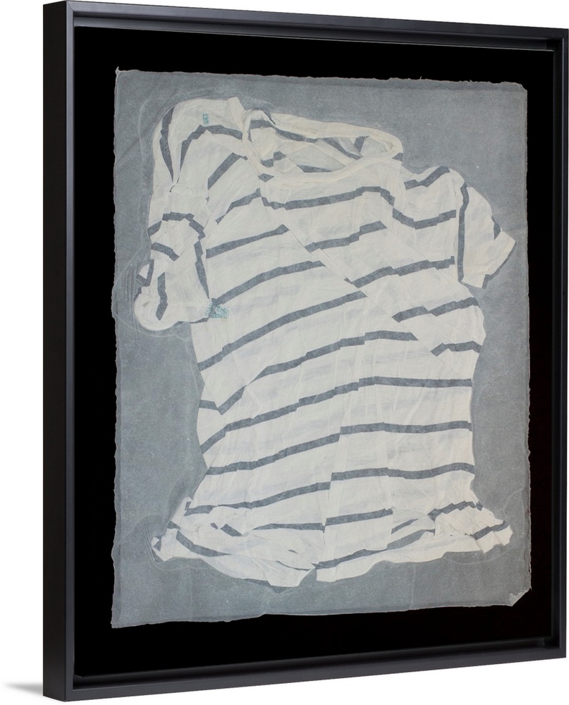 <p>A striped, torn and mended t-shirt suspended in handmade paper.</p>