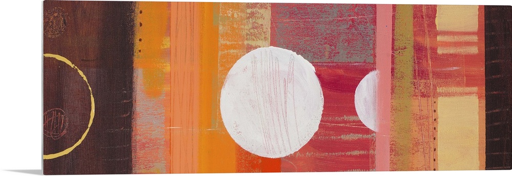 <p>Abstract painting in warm orange and brown shades, with circular shapes and blocks of color.</p>