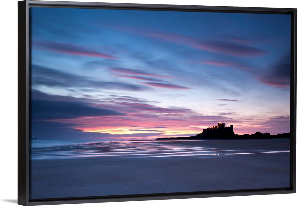 <p>A dramatic dawn of blues, purples, oranges, reds and golden yellows over wet sand at Bamburgh Castle, Northumberland, UK.</p>
