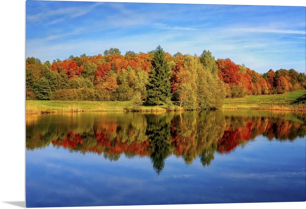 <p>Trees in a variety of fall colors mirrored in a lake with a blue sky above.</p>