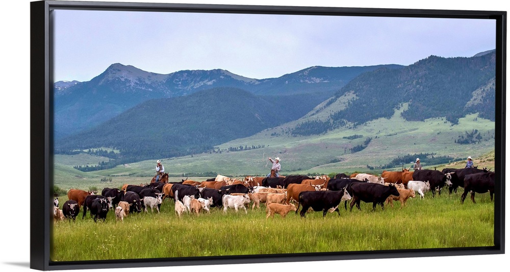 <p>Photograph of cowboys with lassos herding cattle through a valley.</p>