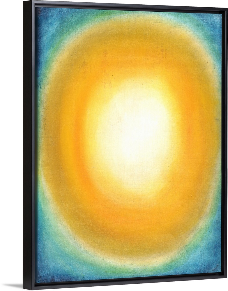 <p>Contemporary abstract painting of a golden oval shape in the center of the image against a crystal blue background.</p>