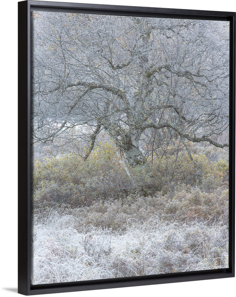 <p>Bare tree with twisting branches in the winter with frost on the ground.</p>