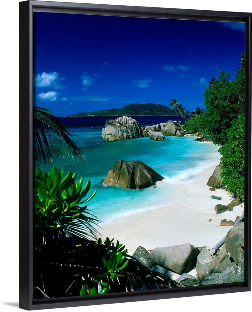 <p>This is vertical photograph of a beach landscape framed by tropical foliage with massive boulders punctuating the water and shore.</p>