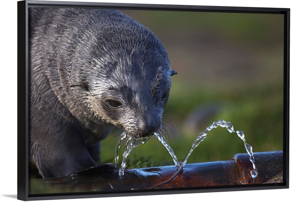 <p>Antarctic Fur Seal pup (Arctocephalus gazella) drinks from a leaking water pipe at the abandoned Husvik whaling station along Stromness Bay, South Georgia Island, Antarctica. | Location: Husvik, South Georgia, South Georgia and the South Sandwich Islands.</p>