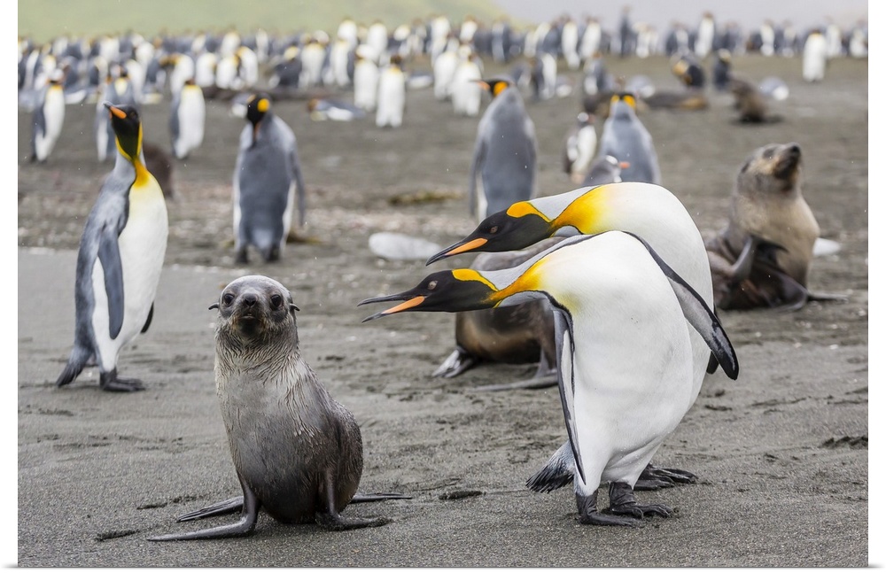 <p>Antarctic fur seal (Arctocephalus gazella) pup with king penguins, Gold Harbour, South Georgia, South Atlantic Ocean, Polar Regions</p>